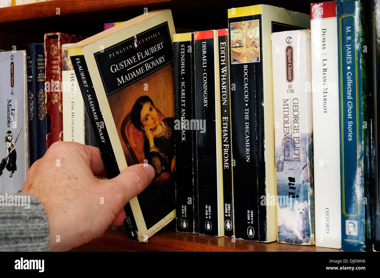 A Hand Taking Gustave Flaubert Madame Bovary From A Bookshelf